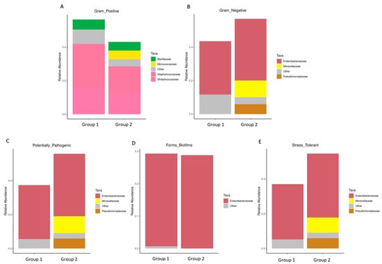 Particularly, Figure 5A,B exhibited a higher abundance of Gram-positive bacteria in Group 1, characterized by the prevalence of Streptococcaceae, Staphylococcaceae, Micrococcaceae, and Bacillaceae. Conversely, Gram-negative bacteria were more abundant in Group 2, as evidenced by the prevalence of Enterobacteriaceae, Moraxellaceae, and Pseudomonadaceae. Consequently, the proportions of potentially pathogenic bacteria and stress-tolerant bacteria were remarkably dominant in the breast milk samples of Group 2 compared to Group 1. However, no significant difference was observed in the abundance of biofilm-forming pathogens between these two groups (Figure 5C–E).