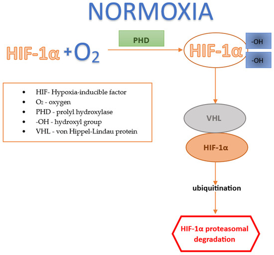 Under normoxic conditions, HIF-1α is hydroxylated in the cytosol by prolyl hydroxylase (PHD), leading to the α-ketoglutarate-dependent binding of HIF-1α to several components: the von Hippel–Lindau (VHL) protein, PHD, aspartate hydroxylase, and HIF inhibitory factor (FIH). This binding activates the ubiquitin ligase system, which targets HIF-1α for proteasomal degradation [18]; see Figure 1.