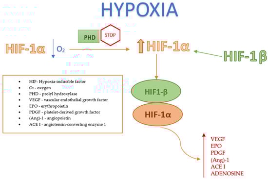 Under hypoxic conditions, the enzymatic activity of PHD is inhibited (as oxygen and iron are essential cofactors for PHD), resulting in an increase in HIF-1α levels. This increase allows HIF-1α to combine with HIF-1β, aiding the body’s adaptation to hypoxia by initiating angiogenesis [19]; see Figure 2. Another pathway for increasing HIF-1α expression involves the inhibition of PHD due to impaired oxidative phosphorylation under hypoxia; this results from the inhibition of succinate dehydrogenase, leading to an accumulation of succinate that binds to the GPR91 receptor in the cytosol. Activation of this receptor suppresses PHD [20]. The HIF-1 complex facilitates tissue adaptation to hypoxic conditions by reprogramming the cellular metabolism (including glucose and iron handling), enhancing glycolysis, increasing mitochondrial NADPH synthesis, and stimulating the production of proangiogenic factors such as VEGF, EPO, platelet-derived growth factor (PDGF), angiopoietin (Ang)-1, angiotensin-converting enzyme 1, and adenosine [7].