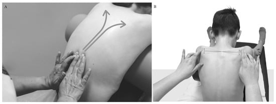 The study was conducted at the Troniny Medical Rehabilitation Center and was based on the data of patients treated from 2014 to 2019. The patient and the parent/guardian were informed by the doctor about the method and procedures used and gave their written consent to the treatment. Qualification for treatment was based on X-ray evaluation in accordance with SOSORT [10] criteria of Cobb’s ≥10° scoliosis combined with vertebral rotation. The study group was treated on an outpatient basis according to a uniform scheme of treatments that occurred once a week at the center and for 20 min a day at home. The program at the center lasted 90 min, with each session comprising of 20 min of individual exercises based on the SRB concept, 20 min of back massage (paraspinal neurostimulation) combined with individual work of a physiotherapist on the trunk fascia (Figure 1A,B), two 20 min sessions of autocorrective breathing exercises on GraviSpine (separated by massage), and 10 min of learning corrected posture during daily activities.