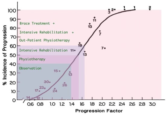 These data illustrate that, particularly in children from groups A and B, there is a high likelihood of scoliosis progression if no treatment is initiated (observation only).