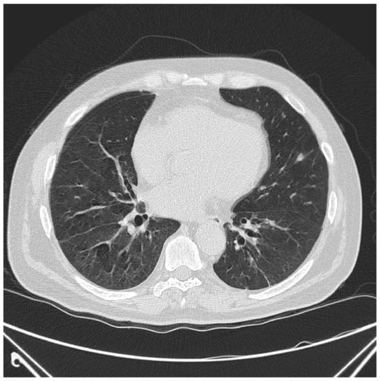 The clinical presentation of ILD in patients with myositis is very variable, often correlating with the autoantibody profile of the patient. Most often, patients have insidious pulmonary complaints, including dyspnea, exercise intolerance, and chronic dry cough; however, some may be asymptomatic [8,9,10]. Fine inspiratory crackles in the lung bases often described as dry crackles may be heard on auscultation and changes may be seen on plain chest radiographs; however, these are relatively insensitive findings and should not be used as screening tests [10,27]. Given the higher mortality and prevalence of ILD in patients with myositis, the recommended testing includes pulmonary function testing (PFTs) with DLCO as well as a 6 min walk test [8,63]. A restrictive lung pattern with low FVC, TLC, and DLCO is suggestive of ILD [63]. Following PFTs serially can be helpful in following ILD progression. The diagnosis of ILD is confirmed with HRCT of the chest, which is the gold standard [63]. Generally, any change in respiratory symptoms or decrease in FVC or DLCO should prompt imaging and further workup [8,9].