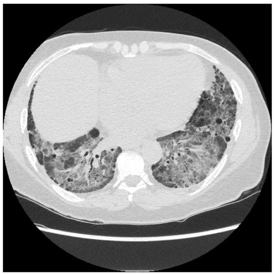 HRCT is used to confirm the diagnosis of ILD. The most common abnormalities seen in myositis-associated ILD on HRCT are cellular nonspecific interstitial pneumonia (NSIP), organizing pneumonia (OP), mixed NSIP/OP pattern, acute interstitial pneumonia (AIP), usual interstitial pneumonia (UIP), and fibrotic pattern. NSIP is characterized by bilateral, symmetrical ground glass opacities (GGOs) with a medial and basal distribution (Figure 6) [10]. The late stages of NSIP will have fibrotic changes and are referred to as fibrotic NSIP. OP often presents with air-space consolidations in a typically subpleural and peribronchial distribution (Figure 7) [10]. Mixed NSIP/OP occurs when consolidations are superimposed on GGOs (Figure 8) [10]. AIP is defined as bilateral patchy GGOs with associated areas of consolidation, but most importantly, symptom presentation within one month. Fibrotic NSIP has a pattern of lung involvement similar to NSIP but has a fibrotic appearance on HRCT (Figure 9) [10]. UIP is included in the fibrotic pattern of the disease as there is often honeycombing, traction bronchiectasis, irregular septal thickening and reticulations especially in the subpleural regions (Figure 10) [10,64]. Overall, the most common HRCT pattern is nonspecific interstitial pneumonia (NSIP); however, there have been studies that show that different MSAs and ASAbs are associated with different patterns of lung involvement [8]. In a report from a cohort study, patients with ASyS (anti-Jo-1, anti-PL-7, anti-PL-12, anti-EJ, anti-OJ) and ILD in China demonstrated that GGOs were very common being seen in >90% of patients, while reticulations were common occurring in 60–90% of patients. Honeycombing was uncommon with anti-Jo-1 (3%), more common with anti-PL-7, anti-PL-12, and anti-EJ (11–23%), and most common with anti-OJ (60%) [65]. NSIP was more common with anti-Jo-1, anti-PL7 and anti-EJ, while OP was common with anti-PL-12, and UIP was seen more often in anti-OJ patients [65].