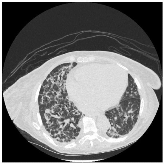 - Palmucci, S.; Di Mari, A.; Cancemi, G.; Pennisi, I.; Mauro, L.A.; Sambataro, G.; Sambataro, D.; Galioto, F.; Fazio, G.; Ferlito, A.; et al. Clinical and Radiological Features of Interstitial Lung Diseases Associated with Polymyositis and Dermatomyositis. Medicina 2022, 58, 1757. [Google Scholar] [CrossRef] [PubMed]