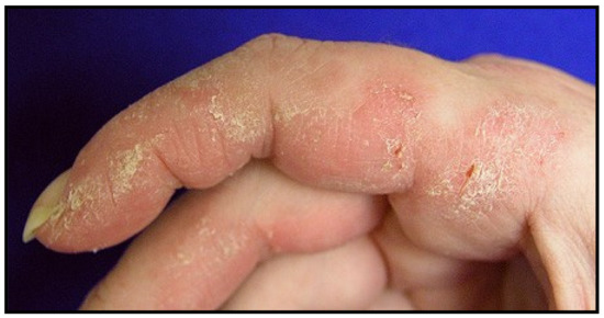 The dermatological findings can be divided into classical and pathognomonic. Classical manifestations on the skin appear in 60–70% of patients with MDA5+ DM and include Gottron’s papules and heliotrope rash; these may look familiar as they are the cutaneous symptoms included in the 2017 EULAR/ACR classification criteria for myositis discussed earlier [53]. Pathognomonic findings revolve around mucocutaneous findings, which are more specific for MDA5+ DM when compared to DM alone [5]. Skin ulceration is the most common of these mucocutaneous findings, occurring in 82% of cases. They often present at specific sites such as an overlying Gottron sign on the proximal interphalangeal (PIP) or metacarpophalangeal (MCP) joints of the fingers, elbows, shoulders, knees, ankles, digital pulp and nail folds; refer to Figure 5 [52]. They are usually deep, punched out, and painful. This manifestation is considered the strongest predictor of ILD in patients with MDA5-DM [52]. Other skin findings include palmar papules, located on MCP and PIP joints, non-scarring alopecia, and calcinosis with fingertip ulcers [5].