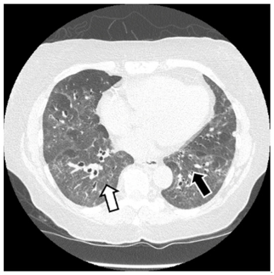 NSIP: diffuse GGOs in the lower lobes (white arrow) and traction bronchiectasis (black arrow) in a patient with ASyS with anti-PL-12 and anti-Ro52.