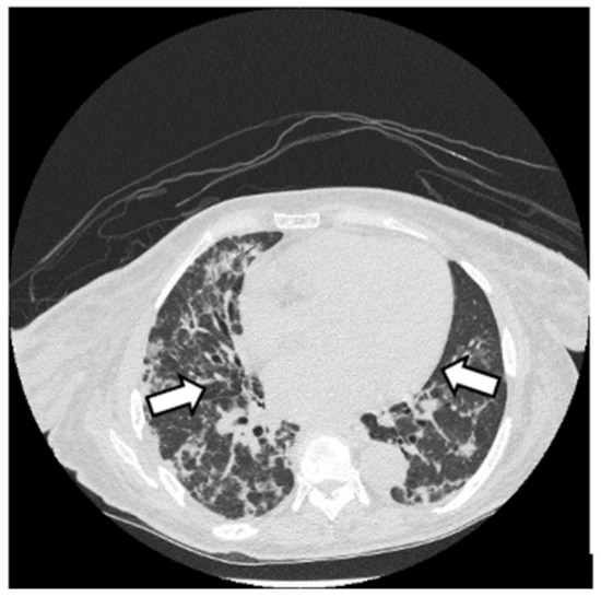 There is a well-established relationship between idiopathic inflammatory myopathies (IIMs, also referred to as myositis) and ILD, particularly with certain subtypes, with lung complications sometimes presenting prior to myopathic manifestations [1,2]. Myositis is a general term that includes many types of inflammatory diseases of the muscle. In this review, the term myositis will be used to include autoimmune myopathies. The subtypes of myositis include those that are strongly associated with ILD, such as polymyositis (PM) and dermatomyositis (DM), with recent review studies showing a prevalence of ILD in PM and DM that may be over 40% [3,4]. These can then be further divided into subtypes using myositis-specific antibodies (MSAs), which are specific for myositis and exclusive to a specific type, and myositis-associated antibodies (MAAs), which can be found in myositis in overlap syndromes with other connective tissue diseases (CTDs). Notably, there is a high prevalence of ILD associated with several MSAs, most strongly with anti-melanoma differentiate factor 5 (MDA5) and the anti-aminoacyl-tRNA synthetase antibodies (ASAb), which help to define antisynthetase syndrome (ASyS) [1]. The prevalence of ILD in MDA5+ patients varies widely across cohorts, ranging from 40 to 100% [5]. Among patients with ASyS, the prevalence of ILD ranges from 70 to 95% depending on the cohort [6]. For the purposes of this review, Bohan and Peter’s 1975 classification criteria for PM and DM, as well as the EULAR/ACR 2017 classification criteria for adult and juvenile myositis and their major subgroups, were utilized in describing the patient population of those affected by myositis-associated ILD, although it is worth noting that MSA and MAA are not included in either criteria [3,7,8]. Clinical presentations of ILD in patients with myositis can vary widely and can be insidious in onset and difficult to diagnose [8,9,10]. ILD can progress rapidly in some cases, so it is essential that clinicians are able to identify and diagnose ILD in patients with myositis. The aim of this review is to highlight the clinical features, diagnostic criteria, important histopathologic, laboratory, and radiographic findings, and treatment modalities for those patients with myositis-associated ILD. To better emphasize these points, we will feature three case reports of patients with myositis-associated ILD.