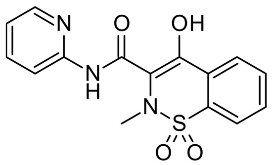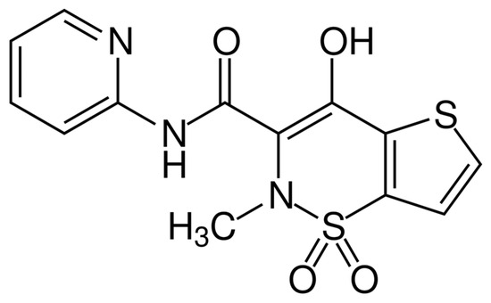 Tenoxicam and piroxicam are the representatives of oxicams, which belong to NSAIDs. They inhibit both COX-1 and COX-2, thus providing therapeutic and side effects resulting from the properties of these enzymes [41,42]. These are inflammation and related symptoms’ (e.g., pain) suppression, gastrointestinal and kidney disorders, or development of hematological complications [43,44,45]. Piroxicam can be administered orally and intramuscularly and is characterized by a long half-life in the plasma. The drug penetrates the synovial fluid and joint spaces, which is beneficial in the context of articular symptoms treatment [46,47]. In the case of tenoxicam, the possible routes of administration are: oral, intravenous, intramuscular, and rectal [48,49]. In the treatment of joint diseases, drugs such as NSAIDs are used, but their prolonged intraoral administration is associated with an increasing risk of side effects’ development [50]. Administered intra-articularly, NSAIDs are expected to act locally and limit or eliminate systemic complications. Piroxicam and tenoxicam are known for eliminating joint pain; therefore, their local administration is examined, i.e., topical or intra-articular [51].
