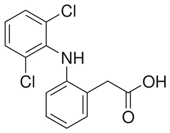 NSAIDs are a large group of drugs classified primarily due to their effect on cyclooxygenases: (1) inhibiting both COX-1 and COX-2 or (2) suppressing primarily COX-2 [7]. Preparations that inhibit COX-1 and COX-2 include, among others, ketoprofen, acetylsalicylic acid, indomethacin, nabumetone, ibuprofen, piroxicam (Figure 1), tenoxicam (Figure 2), meloxicam, diclofenac (Figure 3), naproxen, and nimesulide [8,9]. In turn, drugs that selectively suppress COX-2 are primarily coxibs [10]. These drugs can be administered orally (e.g., in the form of tablets, sachets, and syrups), rectally (suppositories), intravenously, intramuscularly, and in the form of creams, gels, and patches [11,12]. Depending on the classification of NSAIDs, their doses, or the dosing method, they exert both therapeutic effects and potential side effects with varying intensity [13].