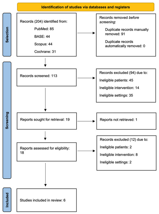 The search identified 204 records, of which 113 remained after manual deduplication (Figure 4). The initial selection with an inter-rater agreement of 92% (κ = 0.64) led to the exclusion of another 94 records. The report by Vallon et al. was not retrieved due to the lack of digitization of the paper article [34]. The remaining 18 reports were retrieved as a full text and assessed in detail for compliance with the established eligibility criteria. We tabulated the reports rejected at this stage, specifying the reasons for exclusion (Table A1). Ultimately, six randomized controlled trials were included.
