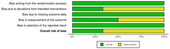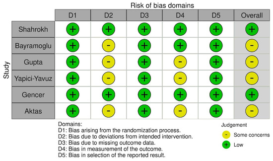 The risk of bias was assessed using RoB 2: A revised Cochrane risk-of-bias tool for randomized controlled trials and is presented in Figure 5 and Figure 6.