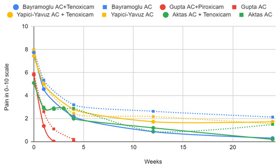 Vapici-Yavuz, 2018 [35]AC + Tenoxicam117.45 ± 2.625.00 ± 3.97
