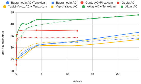 Concerning MMO, after 4 weeks of observation, treatment with tenoxicam did not result in statistically significant differences compared to arthrocentesis alone (Table 8). Piroxicam showed a statistically significant increase in MMO by almost 5 mm compared to the control group, with a large effect size. These results are based on only one trial with study and control groups of 11 patients each and some concerns regarding the risk of bias.