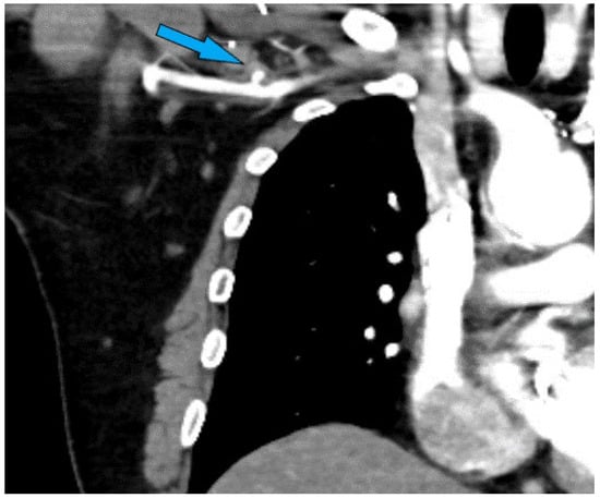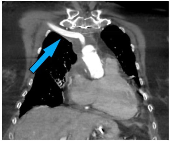 High-resolution CT scans are invaluable in the preoperative assessment, offering detailed cross-sectional images of the thoracic cavity. These scans can identify the location and extent of aortic disease, the presence of calcifications, and the status of potential cannulation sites. CT angiography provides a detailed view of the aortic anatomy, enabling the surgical team to plan the cannulation strategy effectively. The visualization of a “stump” (Figure 4) in the axilla or other indicators of previous graft placements can significantly influence the choice of cannulation site, highlighting areas where caution is needed due to previous surgical alterations.