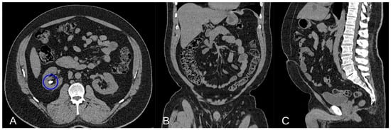 Non-contrast Axial CT scan image demonstrating a calcium lithiasis in a caliceal group of the right kidney (blue circle in (A)). Non-contrast Coronal and Sagittal CT scan showing a good representation of VF ((B,C) respectively).