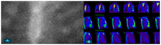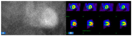 Negative 99mTc-labeled nuclear scintigraphy. (A) Visual grade 0 on planar image; (B) absence of myocardial tracer uptake on single-photon emission computed tomography.
