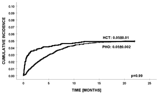 Cumulative incidence of infections with K. pneumoniae in HCT and PHO groups.