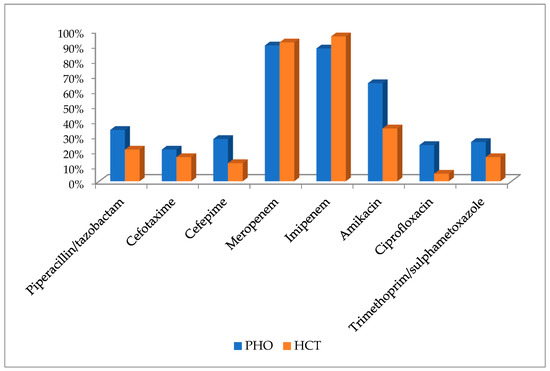 Susceptibility to selected antibiotics was estimated for 405 (349 isolated from PHO patients and 56—HCT) of K. pneumoniae strains. The majority of strains cultured from PHO patients were susceptible to meropenem and imipenem, 315 (90.2%) and 307 (88.0%), respectively. Similarly, the majority of strains cultured from HCT patients were susceptible to imipenem and meropenem, 54 (96.4%) and 52 (92.8%), respectively. In contrast, the lowest numbers and percentages of susceptible strains were observed for cefotaxime—67 strains (19.2%) among PHO patients, and for ciprofloxacin—3 strains (5.4%) among HCT patients. Detailed data regarding susceptibility to selected antibiotics of K. pneumoniae strains are presented in the Figure 2.