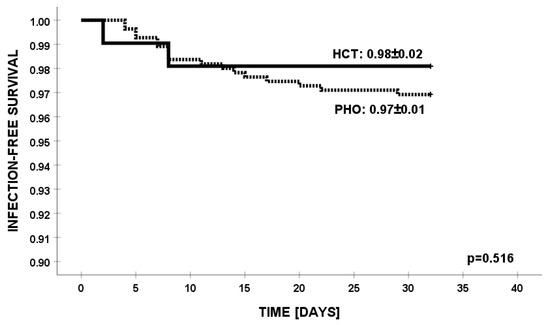 Infection-free survival from infections with K. pneumoniae in HCT and PHO groups.