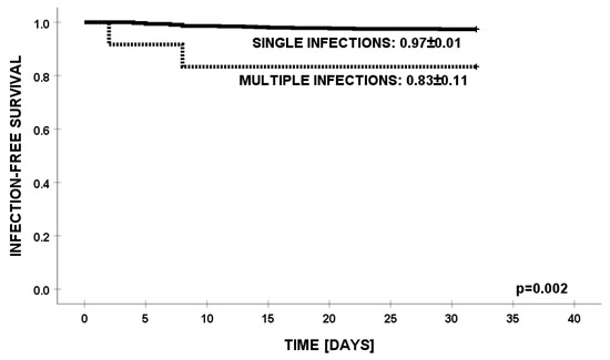 Infection-free survival from infections with K. pneumoniae in patients with multiple infections.