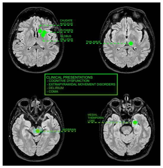 - Sharma, P.; Eesa, M.; Scott, J.N. Toxic and Acquired Metabolic Encephalopathies: MRI Appearance. AJR Am. J. Roentgenol. 2009, 193, 879–886. [Google Scholar] [CrossRef]