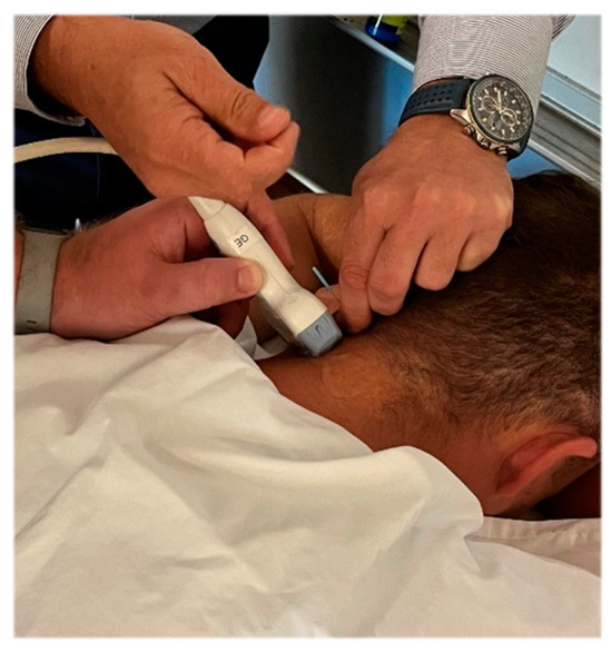 Needle placement while using MSK US for localization of the left OCI. Due to hairline issues, the MSK US was positioned below the needle entry points so the anatomical structures were visualized in the MSK US image.
