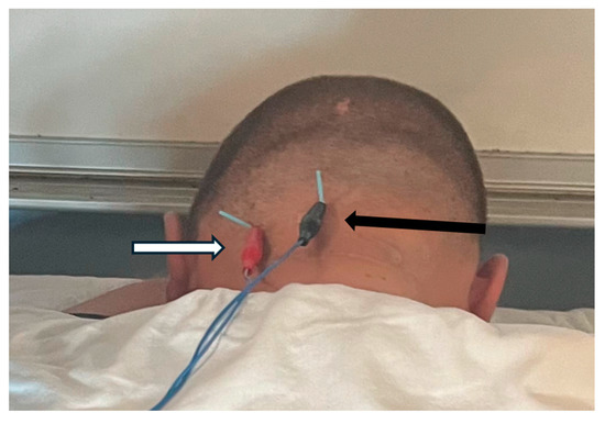 The black arrow (right side) represents the location of the spinous process of the axis, and the white arrow (left side) represents the left transverse process of the atlas. Attached to each dry needle is an electrode.