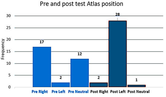 Pre and post intervention palpation for right, left, and neutral atlas positions. Frequency represents the number of subjects.