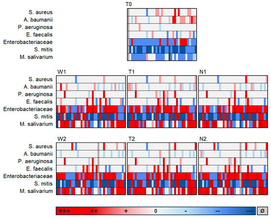 It was also evident that S. mitis was reduced in the postoperative course compared to W0, while M. salivarium increased. Enterobacteriaceae, E. faecalis and P. aeruginosa tended to increase postoperatively, while A. baumannii tended to decrease.