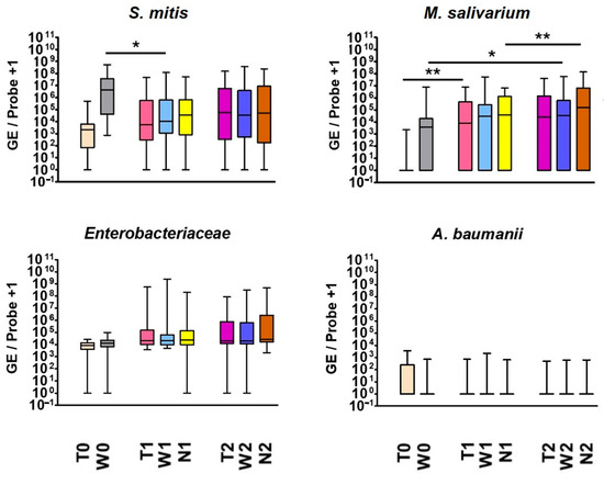 Exemplary results of quantitative bacterial detections (GE/sample) of S. mitis, M. salivarium, Enterobacteriaceae and A. baumannii; the results of all 37 participants are shown on cheek (W), graft (T) and suture swab (N) at the preoperative time point (0), early postoperative time point (1) and late postoperative time point (2). * p <0.05; ** p <0.01.