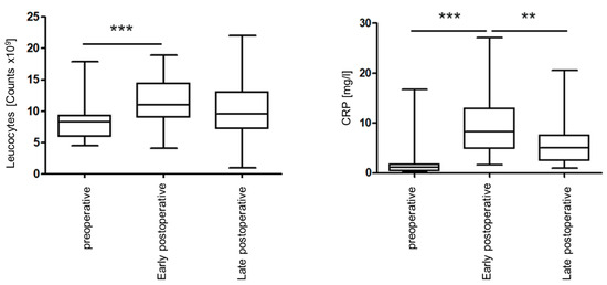 Perioperative leukocyte counts (left) and perioperative C-reactive protein values (right) of all study participants. ** p <0.01; *** p <0.001.
