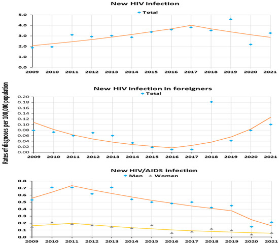 Trends of new HIV diagnoses showed rising changes in the total population (AAPC2009–2021 was +3.7%, p > 0.05) and decreasing changes among foreigners (AAPC2009–2021 was −0.9%, p > 0.05). However, the dynamic of partial trends in the total population differed from the trends among foreigners. For new HIV diagnoses, the first trend was increasing in the general population (APC2009–2017 +8.5%, p < 0.05), and in the second trend, there was a decrease (APC2017–2021 −7.9%, p > 0.05). Among foreigners, the first trend for new HIV diagnoses was negative (APC2009–2016 −23.6%, p > 0.05), and then the direction reversed to positive (APC2016–2021 +50.4%, p > 0.05) (Table 2 and Figure 2).