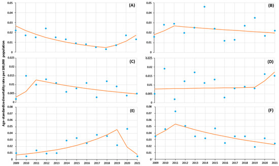Mortality due to HIV/AIDS in 2009–2021 in Poland as a trend modeled with joinpoint regression, (A) tuberculosis, (B) pneumocystis carinii pneumonia, (C) non-Hodgkin lymphoma, (D) dementia, (E) interstitial pneumonitis, (F) non-AIDS-associated.