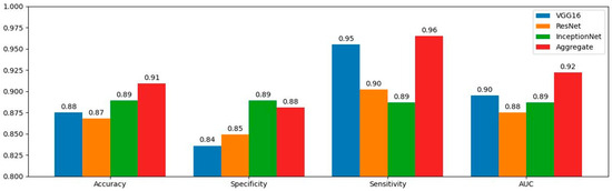 The performances of the three different CNN models (VGG16, ResNet50, and InceptionNet) and the aggregate model were evaluated and based on overall accuracy, sensitivity, specificity, and AUC, with their corresponding 95% confidence interval (CI). Bootstrapping was used to calculate the CI. The results can be found in Table 2 and Figure 1. The corresponding ROC curves appear in Figure 2.
