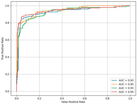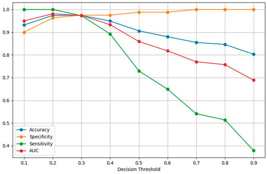 The constraint applied to choose a value for the decision threshold was to maximize sensitivity while also maintaining high specificity. After enforcing a requirement of having a minimum sensitivity of 98.0%, the value of 0.2 was chosen as the benchmark for all our evaluation runs. At the default decision value of 0.5, the specificity of the aggregate model increased significantly at 98.8%; however, the sensitivity dropped to a below acceptable value, considering the implications in a diagnosis of malignancy. Table 3 and Figure 3 portray the values of all the performance metrics of the aggregate model (for the best-performing k-fold) for decision thresholds between 0.1 and 0.9 with a step of 0.1, with a decision threshold probability of 0.2.