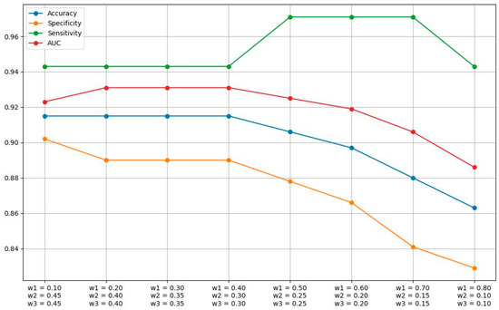 Graph of the performance metrics for the aggregate model in an average k-fold with a test-set size of 117 cases, for varying weights of each pre-trained model. Decision threshold of 0.2.