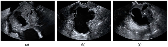 The most frequent histological type in false-positive cases by the aggregate model were cystadenomas and endometriomas. In total, 14 cystadenomas and 14 endometriomas were wrongfully classified as malignant by the model. Additionally, 10 cystadenomas and 5 endometriomas were also misclassified as malignant by subjective assessment. Out of these, eight cystadenomas and four endometriomas were misclassified by both the aggregate model and the SA. The total amount of mislabeled cases by the model was calculated as the sum of false positives and false negatives, added over all k-folds. The histopathology of misclassified cases by the aggregate model and subjective assessment can be found in Table 5. Ultrasound images of misclassified images by the CNNs can be found in Figure 5 and Figure 6.