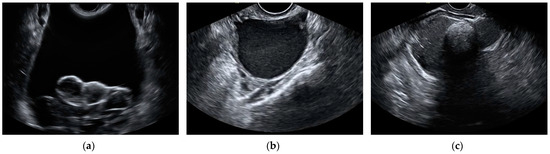 Still ultrasound images of benign ovarian masses misclassified as malignant by the aggregate model. (a) Serous cystadenoma, (b) endometrioma, and (c) mature cystic teratoma.