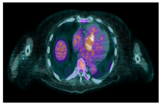 - Wahadat, A.R.; Tanis, W.; Scholtens, A.M.; Bekker, M.; Graven, L.H.; Swart, L.E.; den Harder, A.M.; Lam, M.G.; De Heer, L.M.; Roos-Hesselink, J.W.; et al. Normal imaging findings after aortic valve implantation on 18F-Fluorodeoxyglucose positron emission tomography with computed tomography. J. Nucl. Cardiol. 2021, 28, 2258–2268. [Google Scholar] [CrossRef] [PubMed]