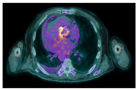 - Saby, L.; Habib, G.; Laas, O.; Cammilleri, S.; Casalta, J.P.; Gouriet, F.; Riberi, A.; Avierinos, J.F.; Raoult, D.; Thuny, F. Positron emission tomography/computed tomography for diagnosis of prosthetic valve endocarditis: Increased valvular 18F-fluorodeoxyglucose uptake as a novel major criterion. J. Am. Coll. Cardiol. 2013, 61, 2374–2382. [Google Scholar] [CrossRef] [PubMed]