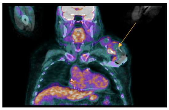 - Mikail, N.; Benali, K.; Mahida, B.; Vigne, J.; Hyafil, F.; Rouzet, F.; Le Guludec, D. 18F-FDG-PET/CT Imaging to Diagnose Septic Emboli and Mycotic Aneurysms in Patients with Endocarditis and Cardiac Device Infections. Curr. Cardiol. Rep. 2018, 20, 14. [Google Scholar] [CrossRef] [PubMed]