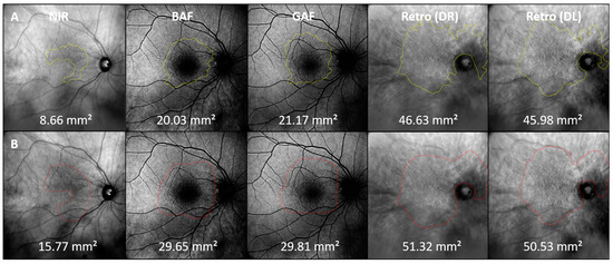 SDD en-face area detection by readers. Example of SDD en-face areas manually outlined by two independent readers (A,B). NIR: near-infrared; BAF: blue fundus autofluorescence; GAF: green fundus autofluorescence; DR: Retro mode imaging deviated right; DL: deviated left.