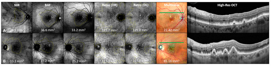The largest en-face area covered by drusen was determined in the Retro mode, with a mean area of 105.2 ± 45.9 mm2 (DL) and 105.4 ± 45.5 mm2 (DR). Compared to Retro mode imaging, the overall mean en-face areas assessed in the conventional retinal imaging modalities were smaller, with 53.2 ± 44.7 mm2 in NIR, 50.9 ± 42.6 mm2 in GAF, 49.1 ± 42.9 mm2 in BAF, and 60.6 ± 45.5 mm2 in multicolor imaging. In non-parametric testing, the difference was statistically highly significant (p < 0.001) for all conventional retinal imaging modalities: NIR, GAF, BAF and multicolor imaging. Two representative examples of en-face drusen area quantification in study participants with the presence of sub-RPE drusen and SDDs are given in Figure 3.