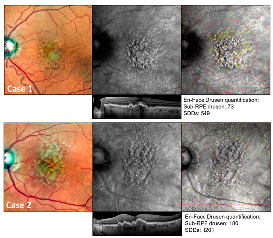 While sub-RPE drusen volume has already been acknowledged as a risk factor for AMD progression, there are still no widely accepted quantitative parameters that can be used to determine SDDs’ impact on AMD progression [24,25,42]. Imaging methods that enable the fast and accurate quantification (number, distribution, area of occupation) of SDDs are, therefore, desirable. While annotation was undertaken manually in our study, future artificial-intelligence-assisted automatic algorithms might help to speed up this process in a larger study cohort and in long-term follow-up.