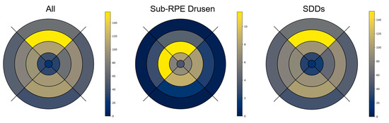 The following supporting information can be downloaded at: https://www.mdpi.com/article/10.3390/jcm13144131/s1, Figure S1: Modified ETDRS grid. Table S1: Number of sub-RPE drusen and SDDs in the subfields of the modified ETDRS (mETDRS) grid.