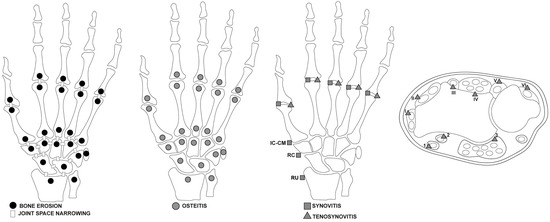 - McQueen, F.M.; Stewart, N.; Crabbe, J.; Robinson, E.; Yeoman, S.; Tan, P.L.; McLean, L. Magnetic resonance imaging of the wrist in early rheumatoid arthritis reveals a high prevalence of erosions at four months after symptom onset. Ann. Rheum. Dis. 1998, 57, 350–356. [Google Scholar] [CrossRef]