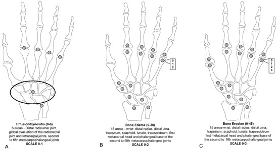 - Sewerin, P.; Buchbender, C.; Vordenbäumen, S.; Scherer, A.; Miese, F.; Brinks, R.; Wittsack, H.J.; Klein, S.; Schneider, M.; Antoch, G.; et al. Advantages of a combined rheumatoid arthritis magnetic resonance imaging score (RAMRIS) for hand and feet: Does the RAMRIS of the hand alone underestimate disease activity and progression? BMC Musculoskelet. Disord. 2014, 15, 104. [Google Scholar] [CrossRef] [PubMed]