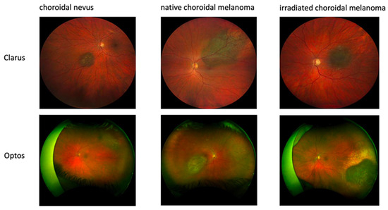 Models involving both Optos and Clarus images were tested on an independent test set of 100 images for trinary classification (33 choroidal nevi, 33 naïve choroidal melanomas, and 34 irradiated choroidal melanomas) and 66 images (33 nevi and 33 naïve choroidal melanomas) for binary classification (benign vs. malignant). Overall, binary classification of malignancy showed improved discriminative performance compared to trinary classification.