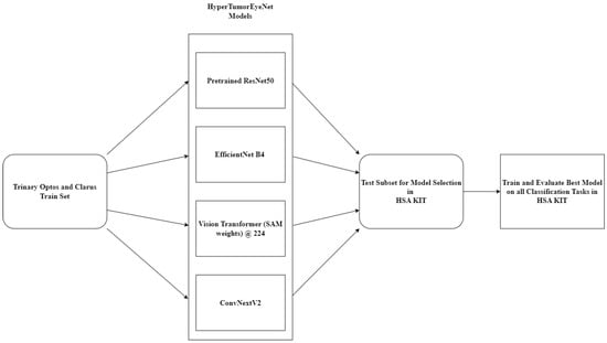 23], was employed using the software HSA KIT version 1.5.13.10 for trinary (nevus vs. treatment-naïve melanoma vs. irradiated melanoma) and binary (nevus vs. treatment-naïve melanoma) classifications. The standard ResNet50 model was initialized using pretrained weights provided by the HSA KIT. The pretrained weights were created by training the ResNet50 model in a supervised manner on a variety of medical classification tasks. Besides the ResNet50 model, we additionally compared HyperTumorEyeNet based on EfficientNet B4, Vision Transformer initialized with Segment Anything weights (due to the positional embedding, an image size of 224 was used), and, finally, a ConvNextV2 base model [