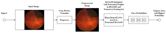 22]. Although transformers have achieved significant breakthroughs in recent years, their lack of inductive bias requires an enormous amount of data. Therefore, in our study design, we employed a CNN due to the limitation in relation to the amount of training data in regard to the low prevalence of the disease. A convolutional neural network (CNN) architecture named HyperTumorEyeNet, based on ResNet50 [